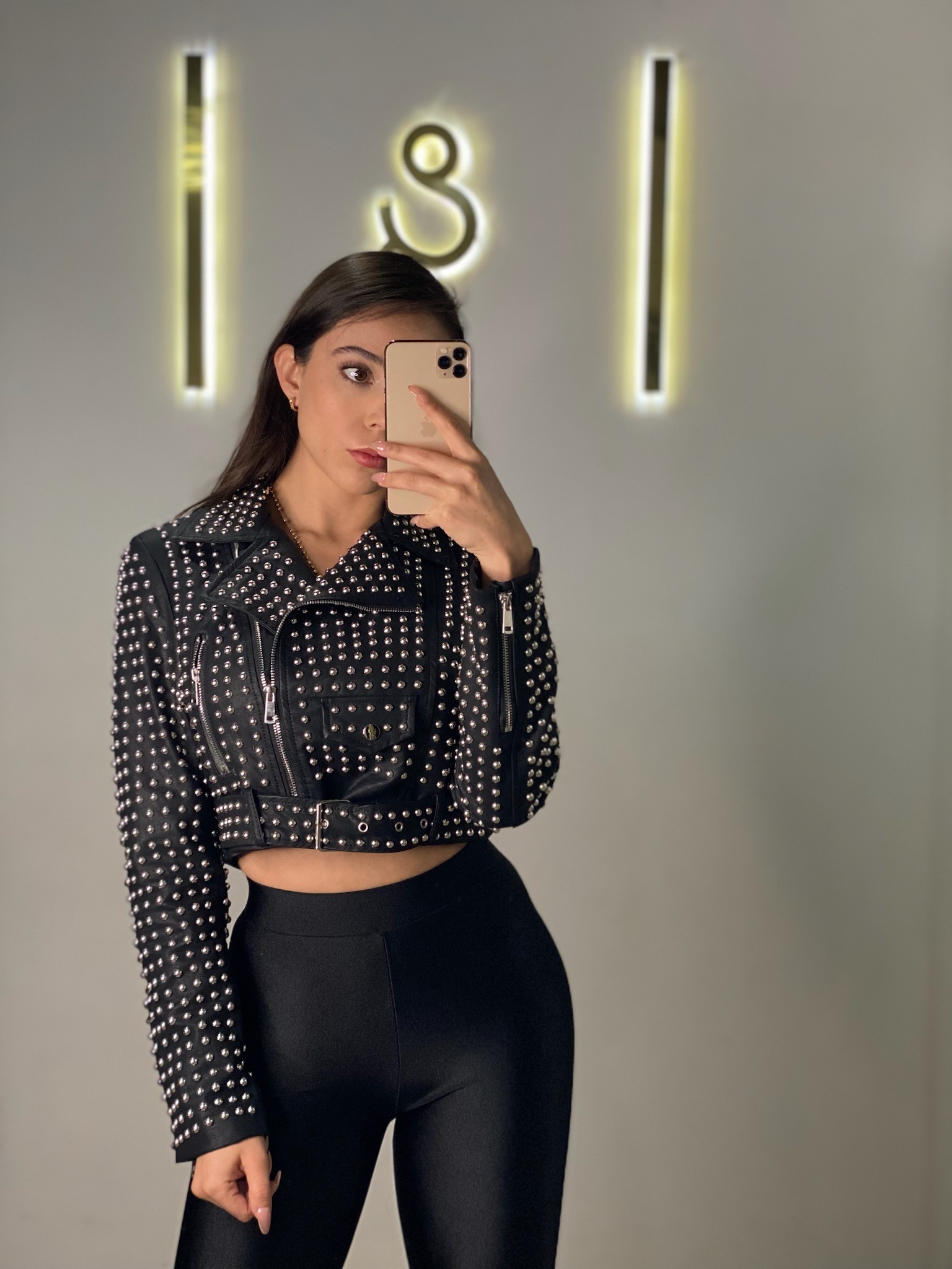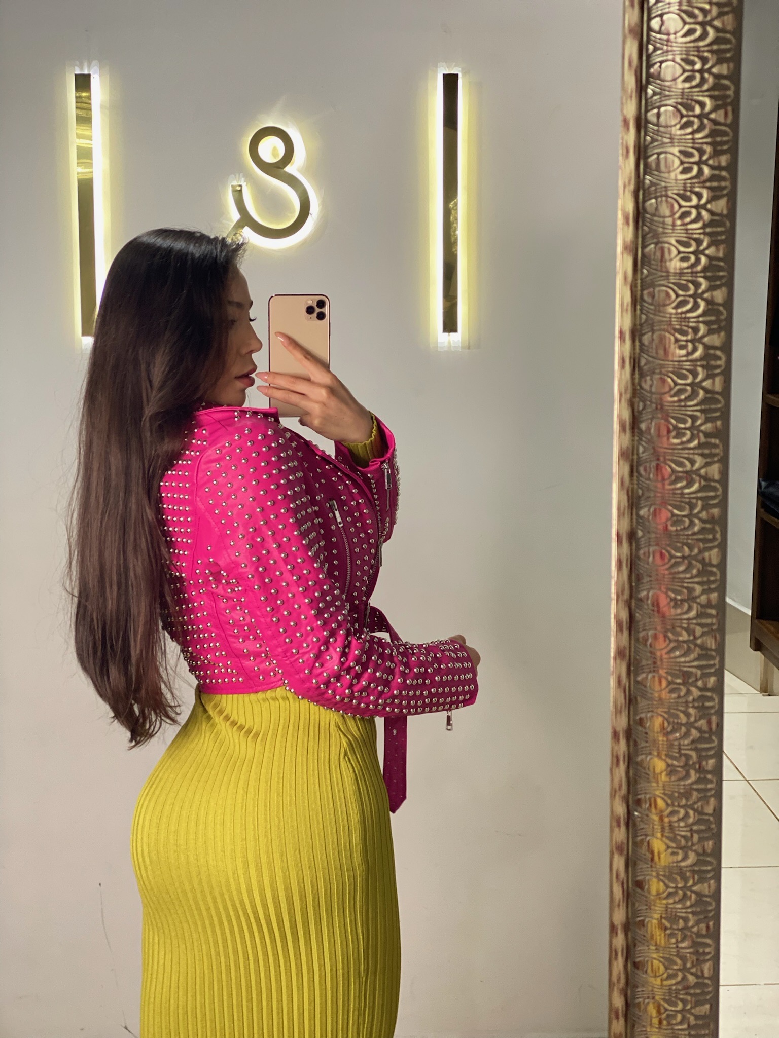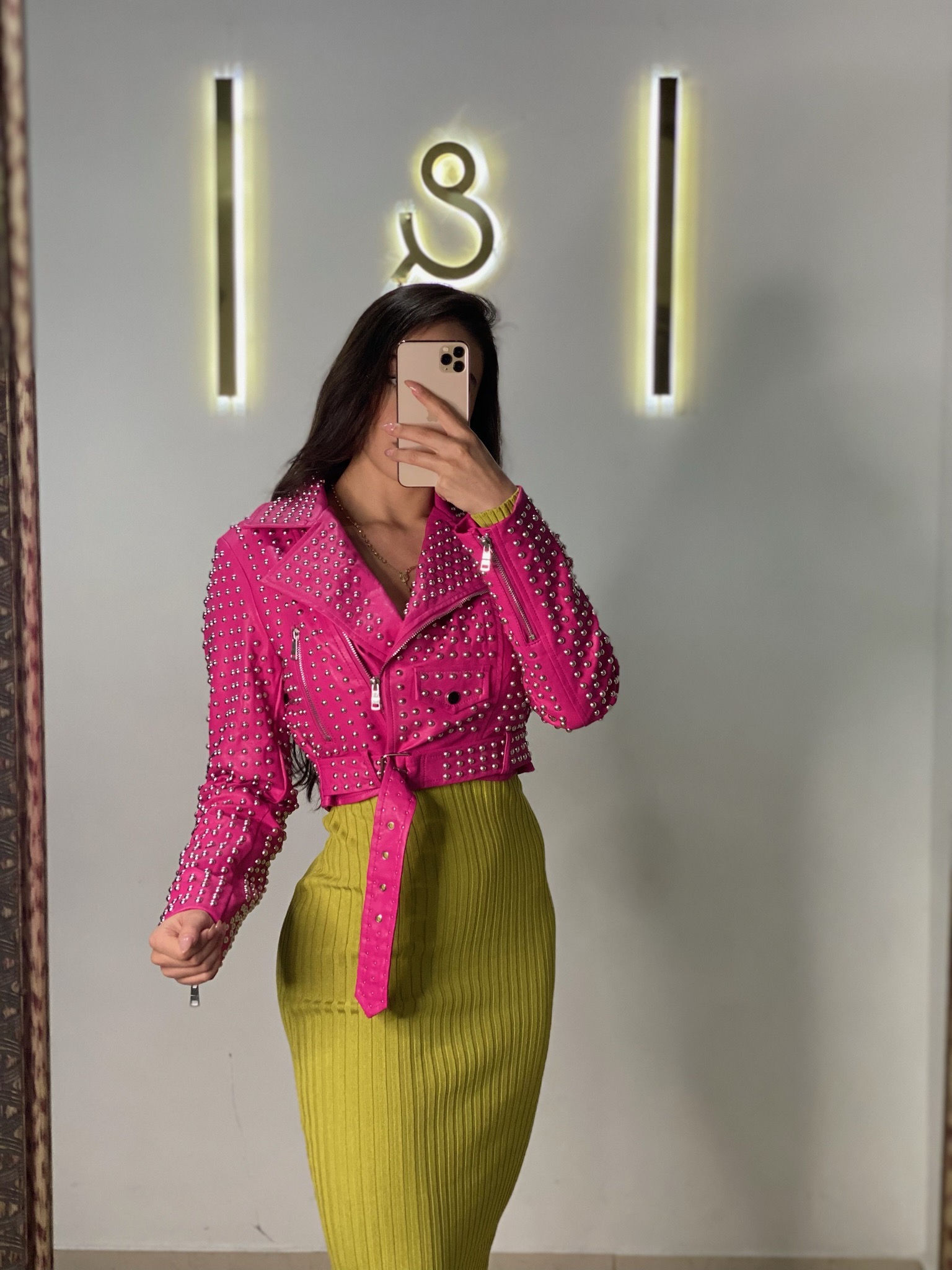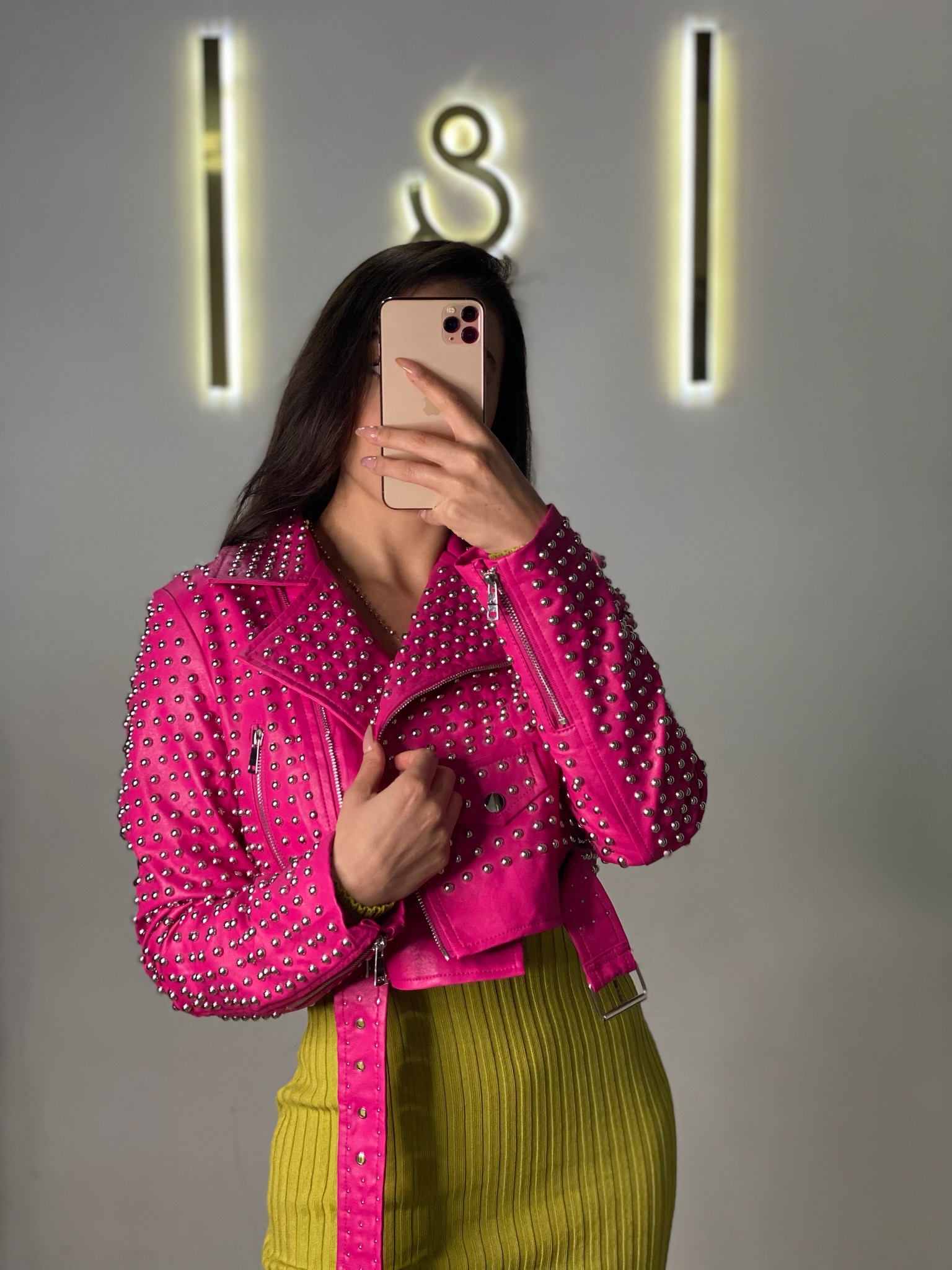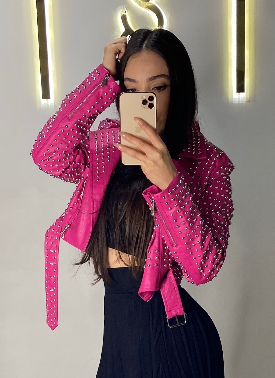 Chamarra crop de piel color fucsia con estoperoles plateados.