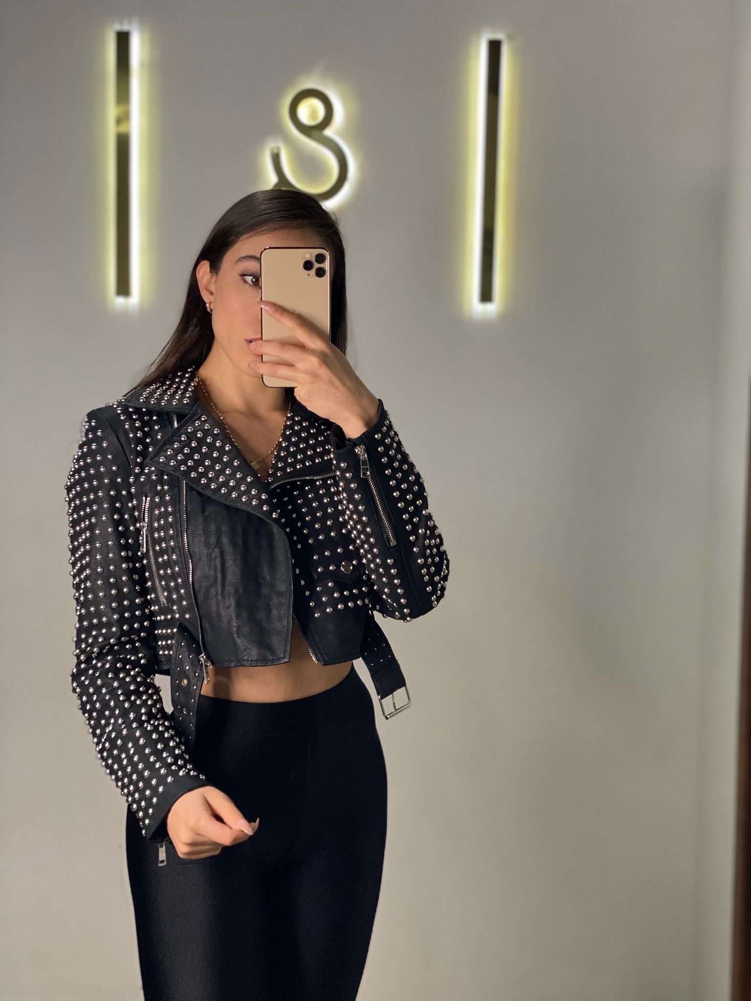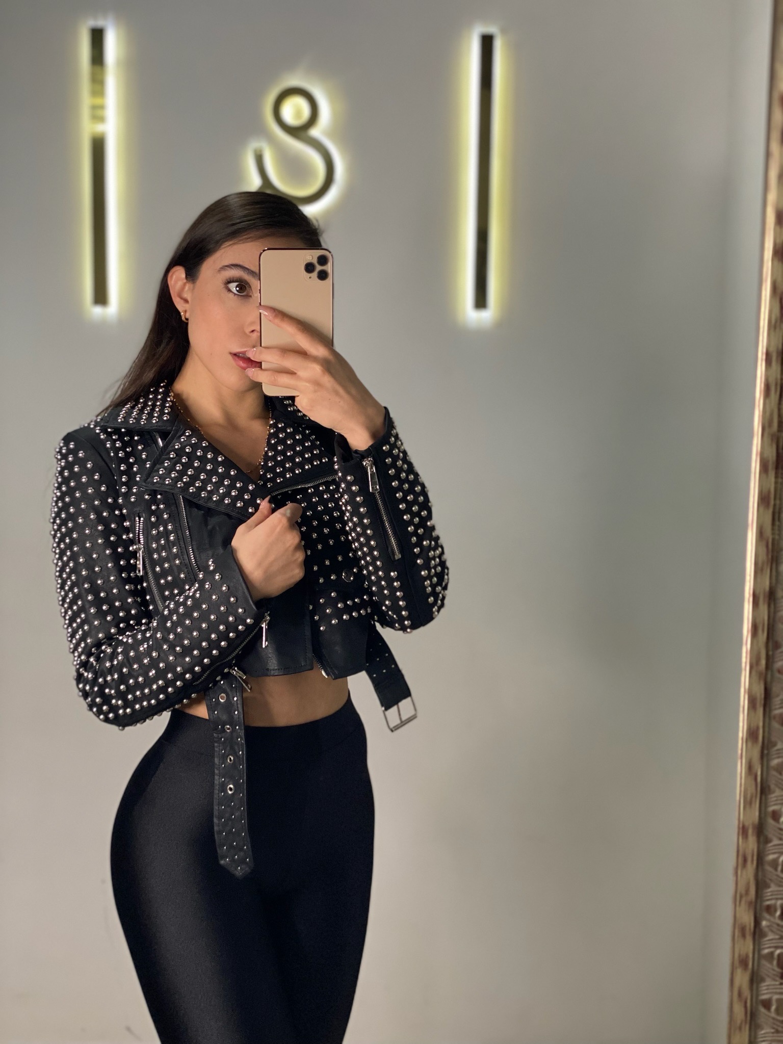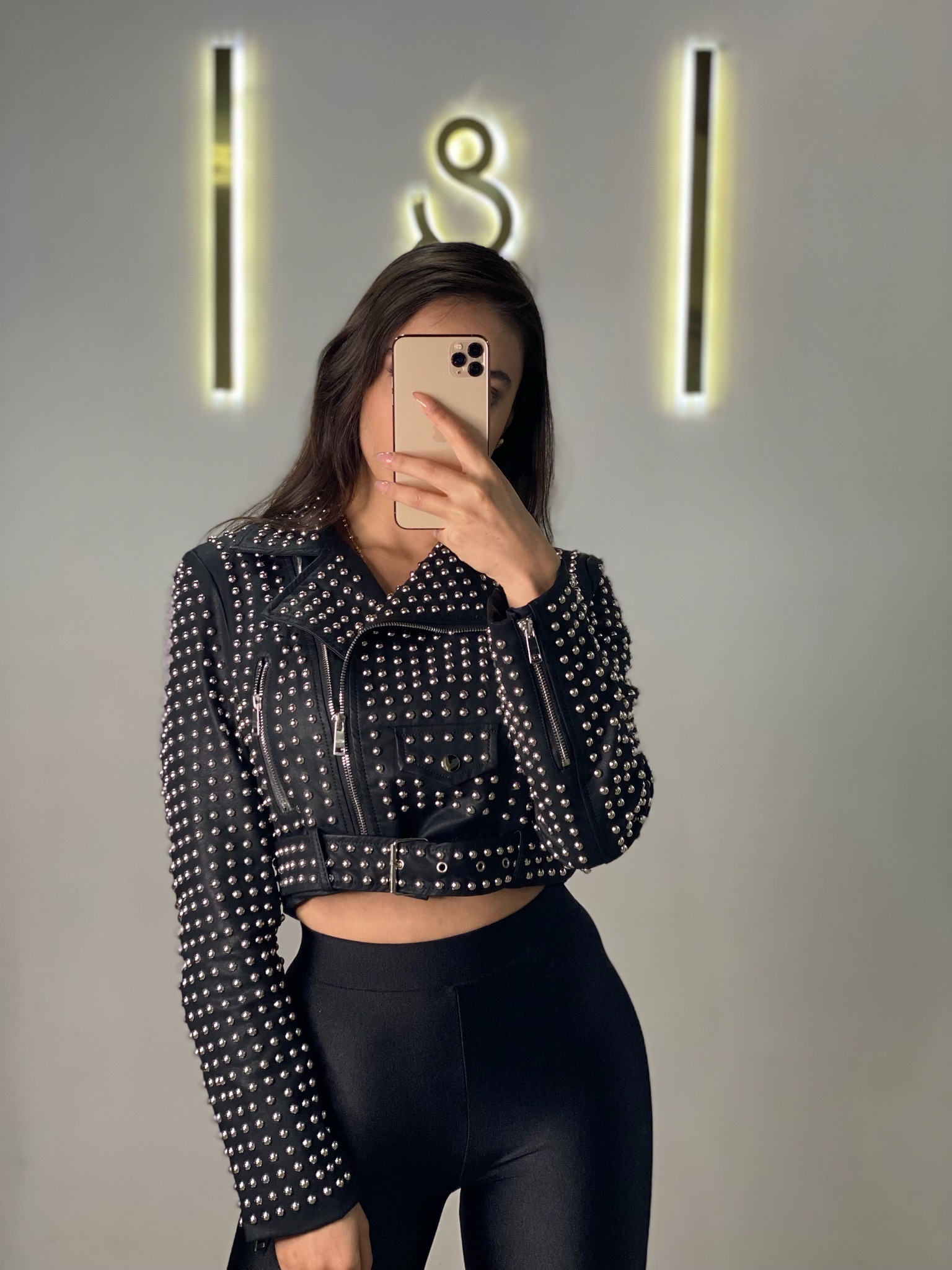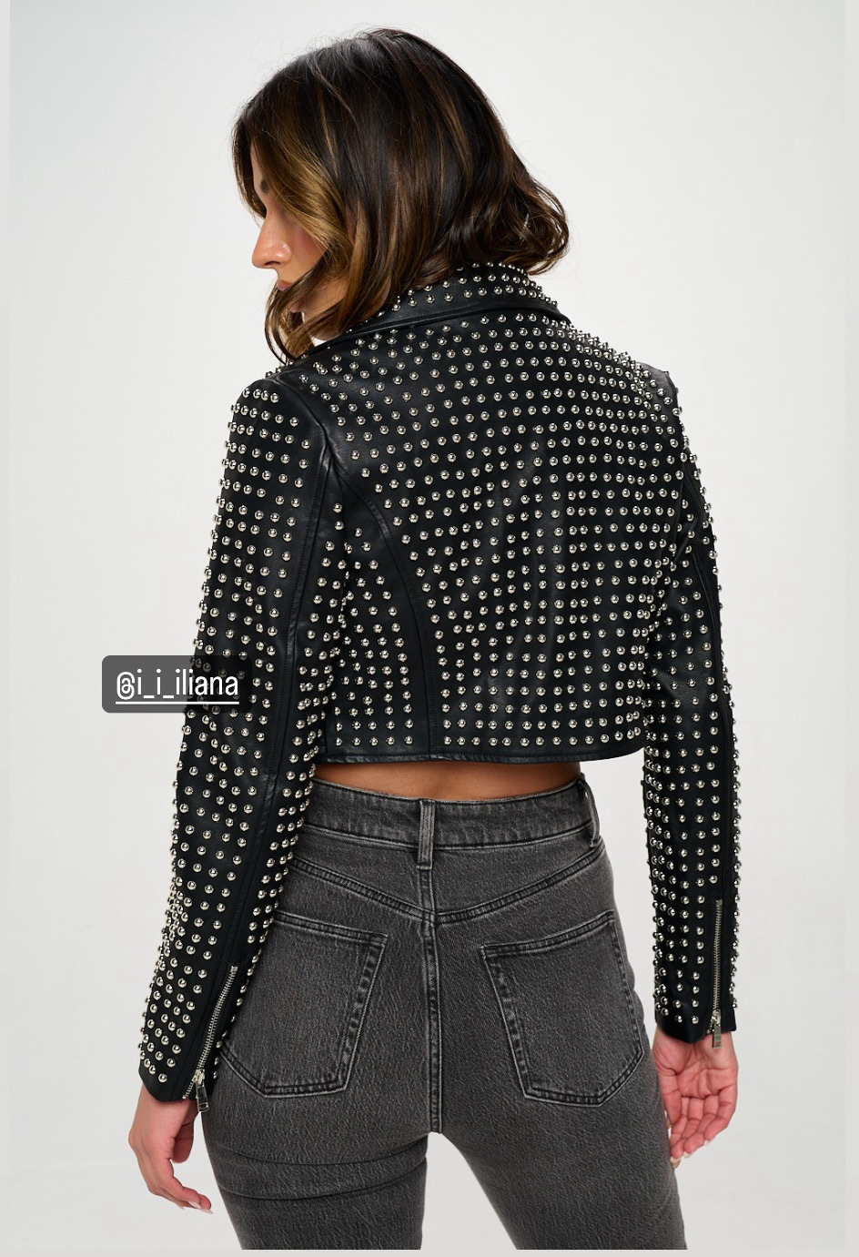 Chamarra crop de piel color fucsia con estoperoles plateados.