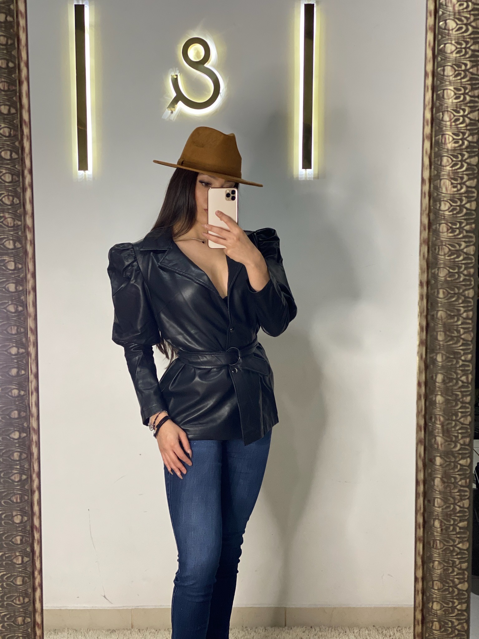 Chamarra larga de piel color negro con cinto, botones y detalle en el hombro