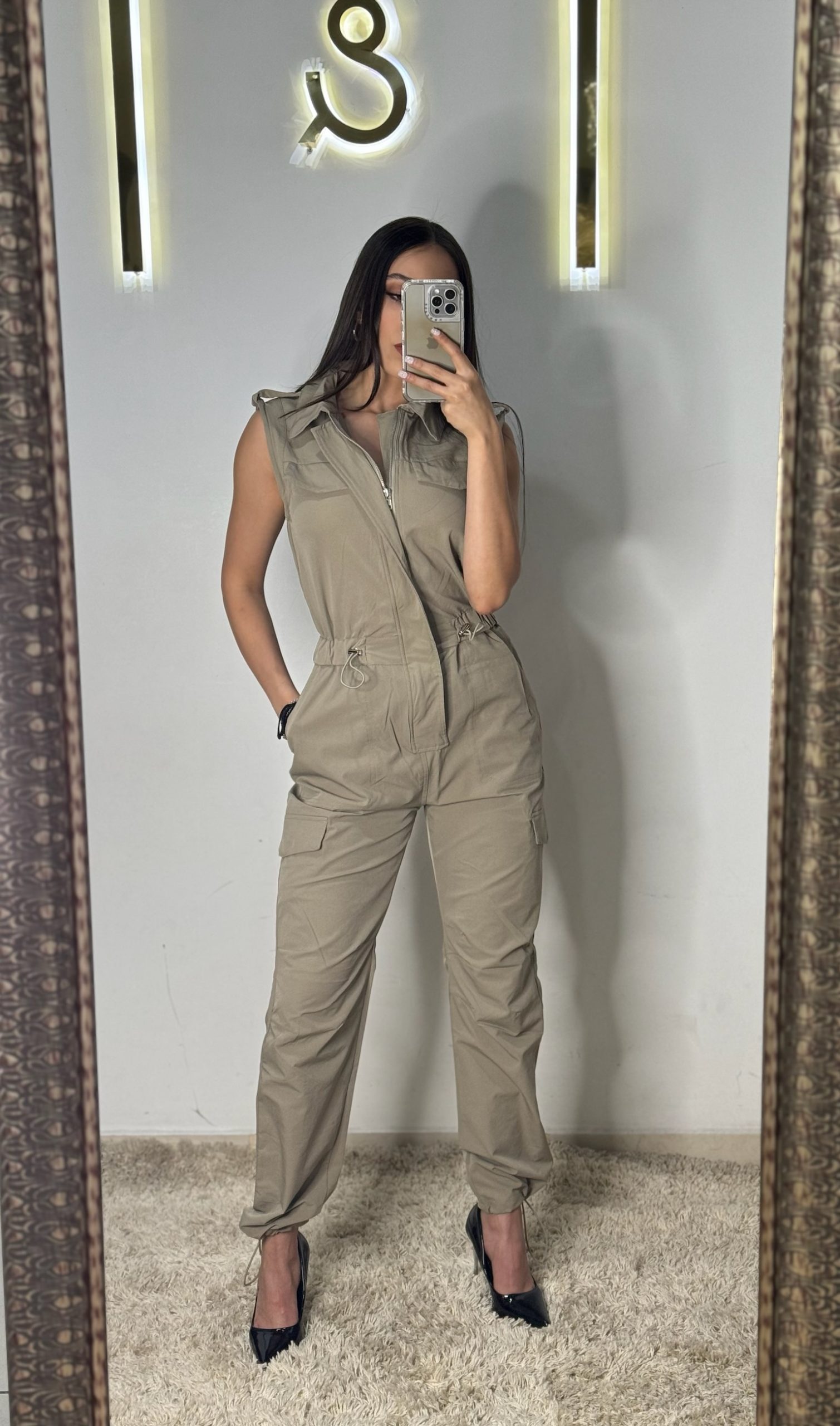 Jumpsuit de rompe vientos color beige, sin manga, con ajuste en la cintura y cierre.