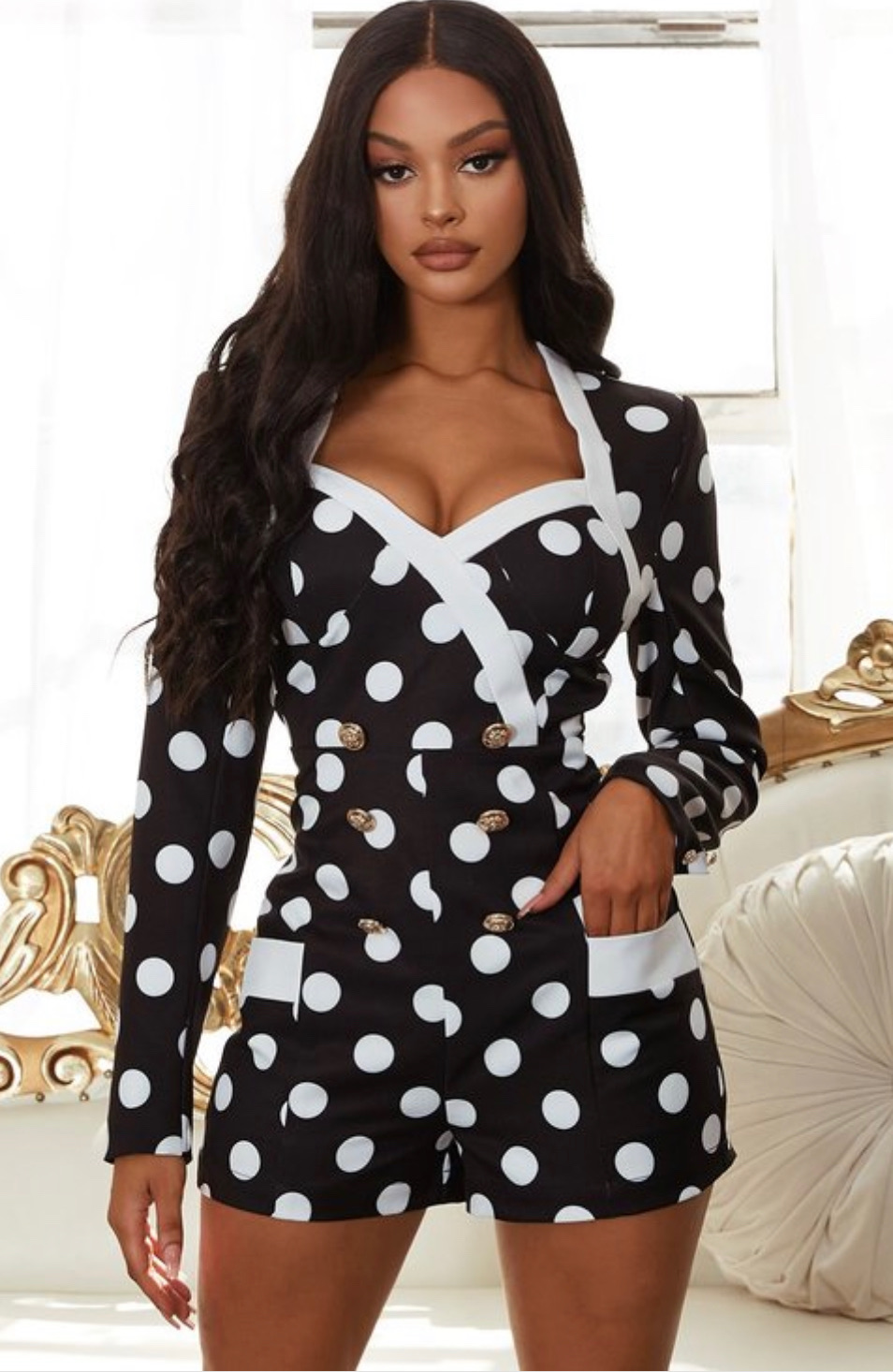 Jumpsuit elegante color negro con puntos blancos. Bolsas al frente en la parte del short y botones dorados.