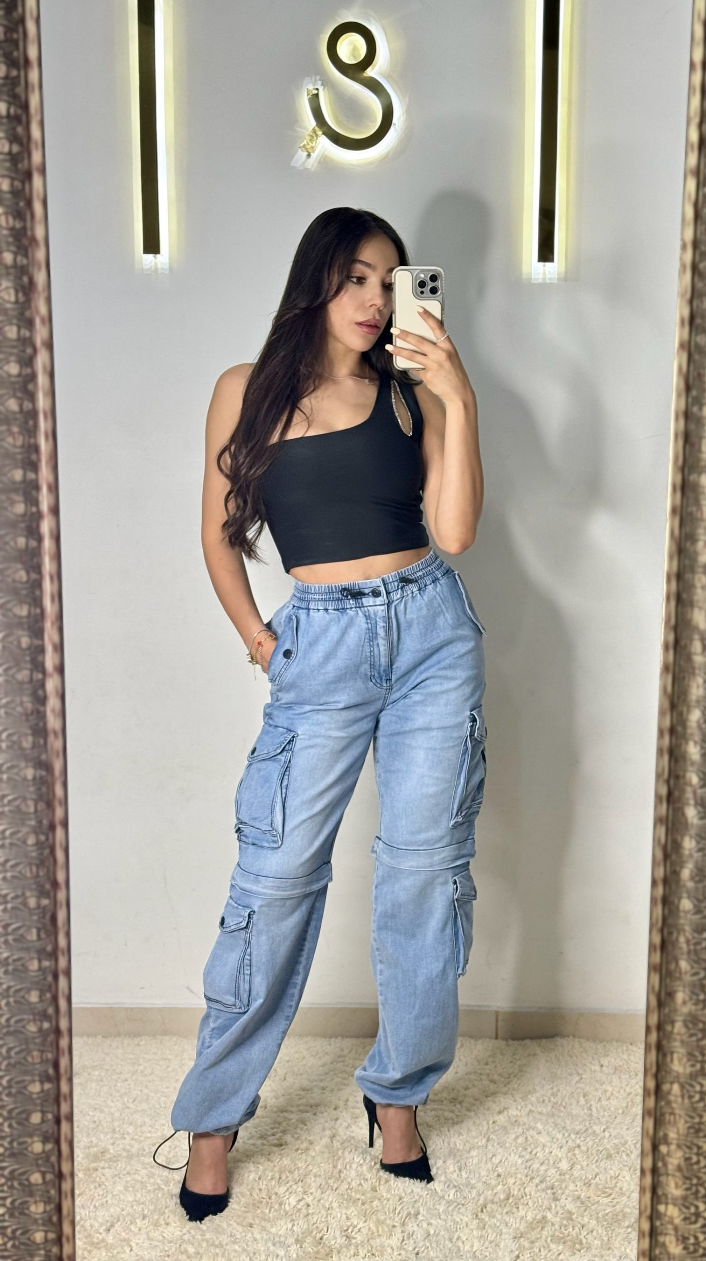 Pantalón cargo de mezclilla clara con ajuste en los pies.