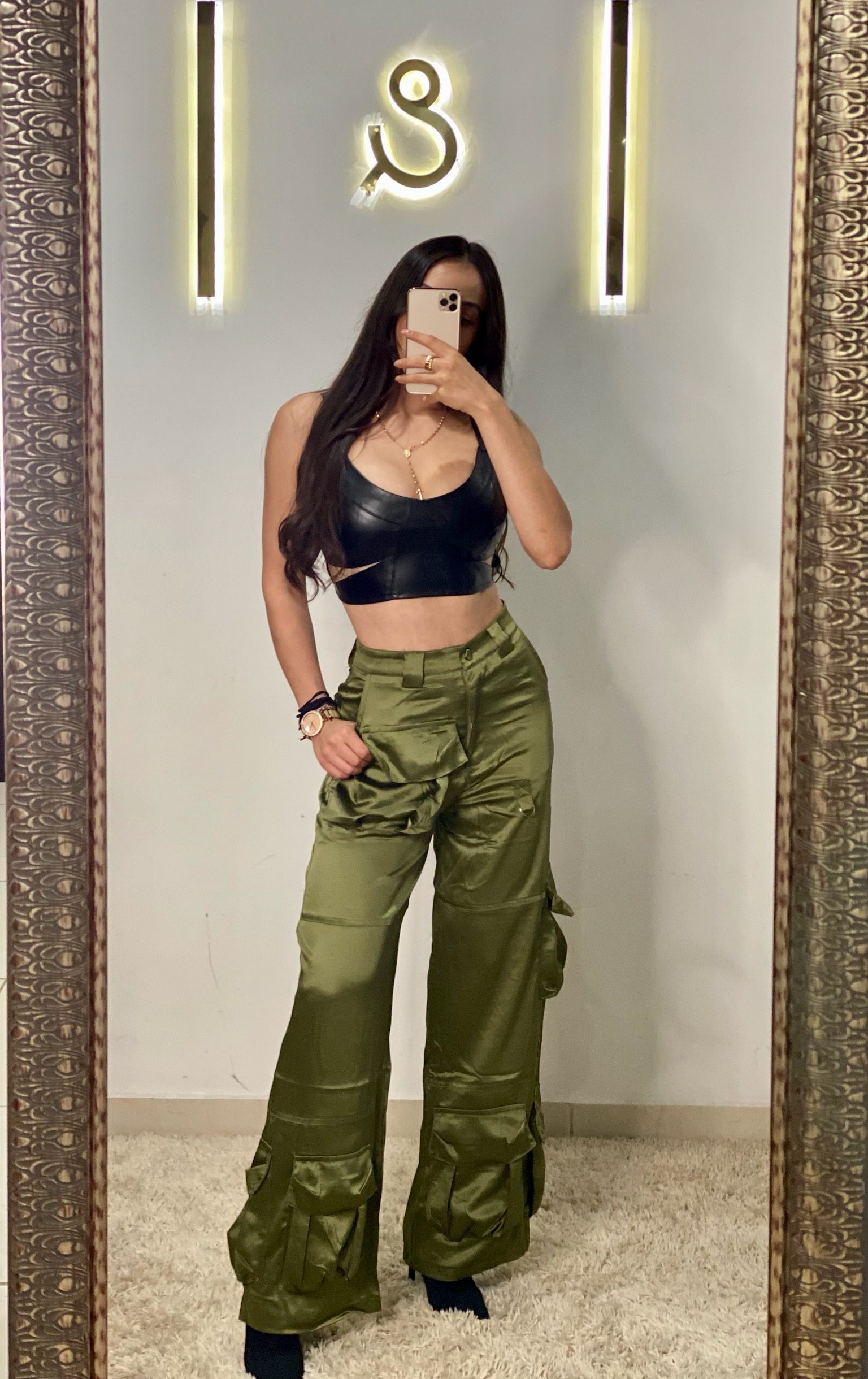 Pantalón de satín color verde olivo tipo cargo
