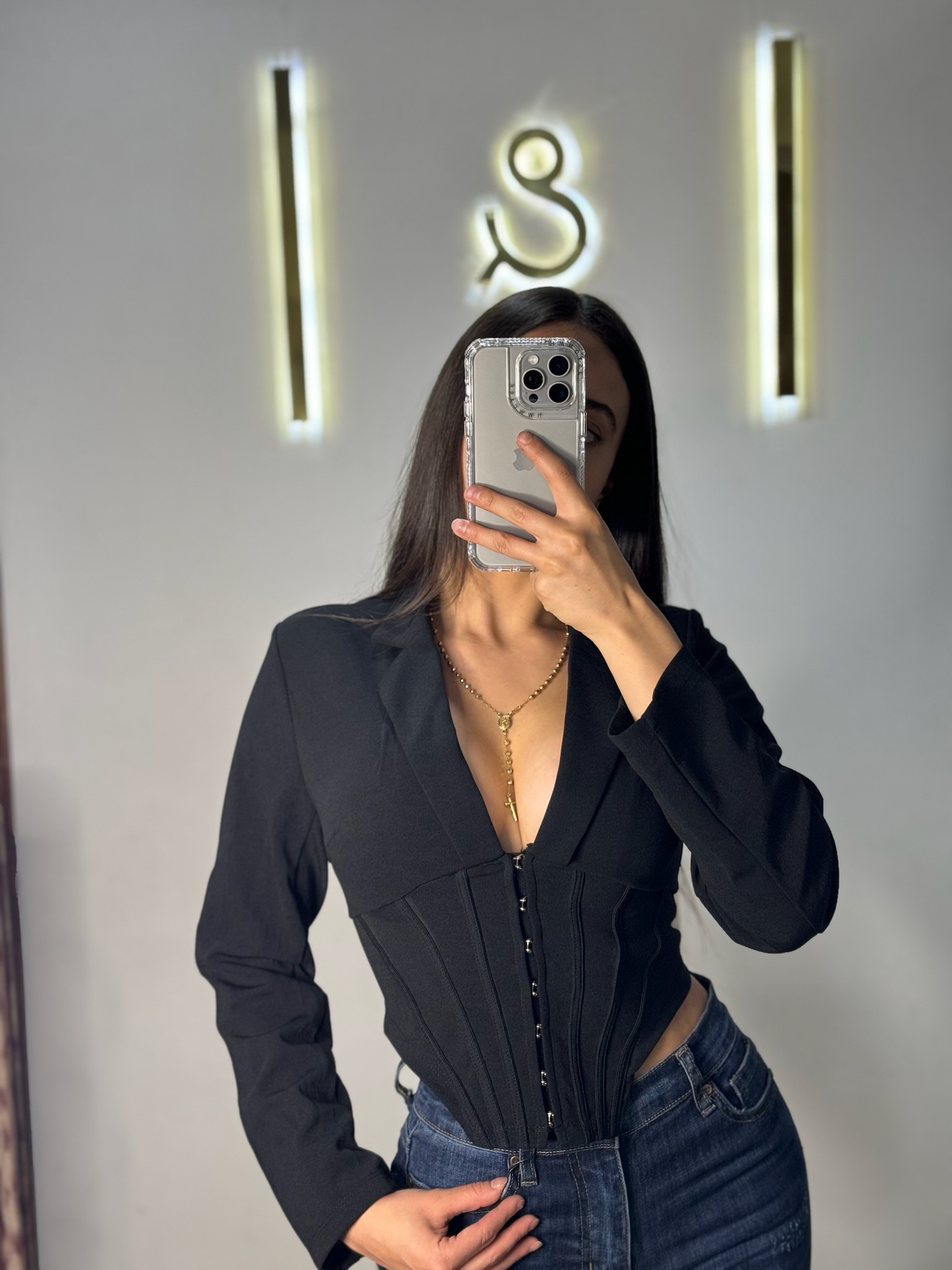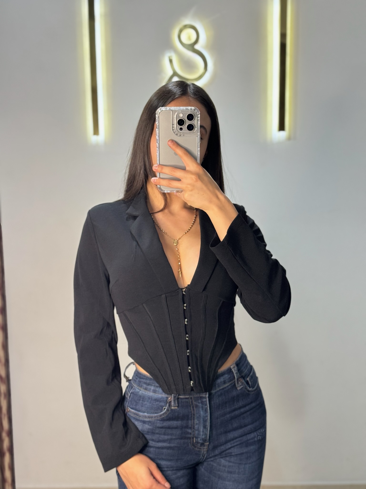 Blusa tipo corset con cuello estilo camisa y manga larga color negro.