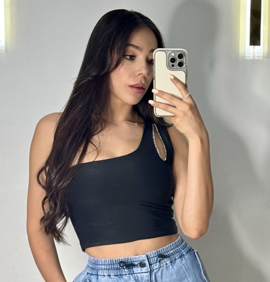 Top corto de licra color negro de un solo hombro con detalle de cristales.
