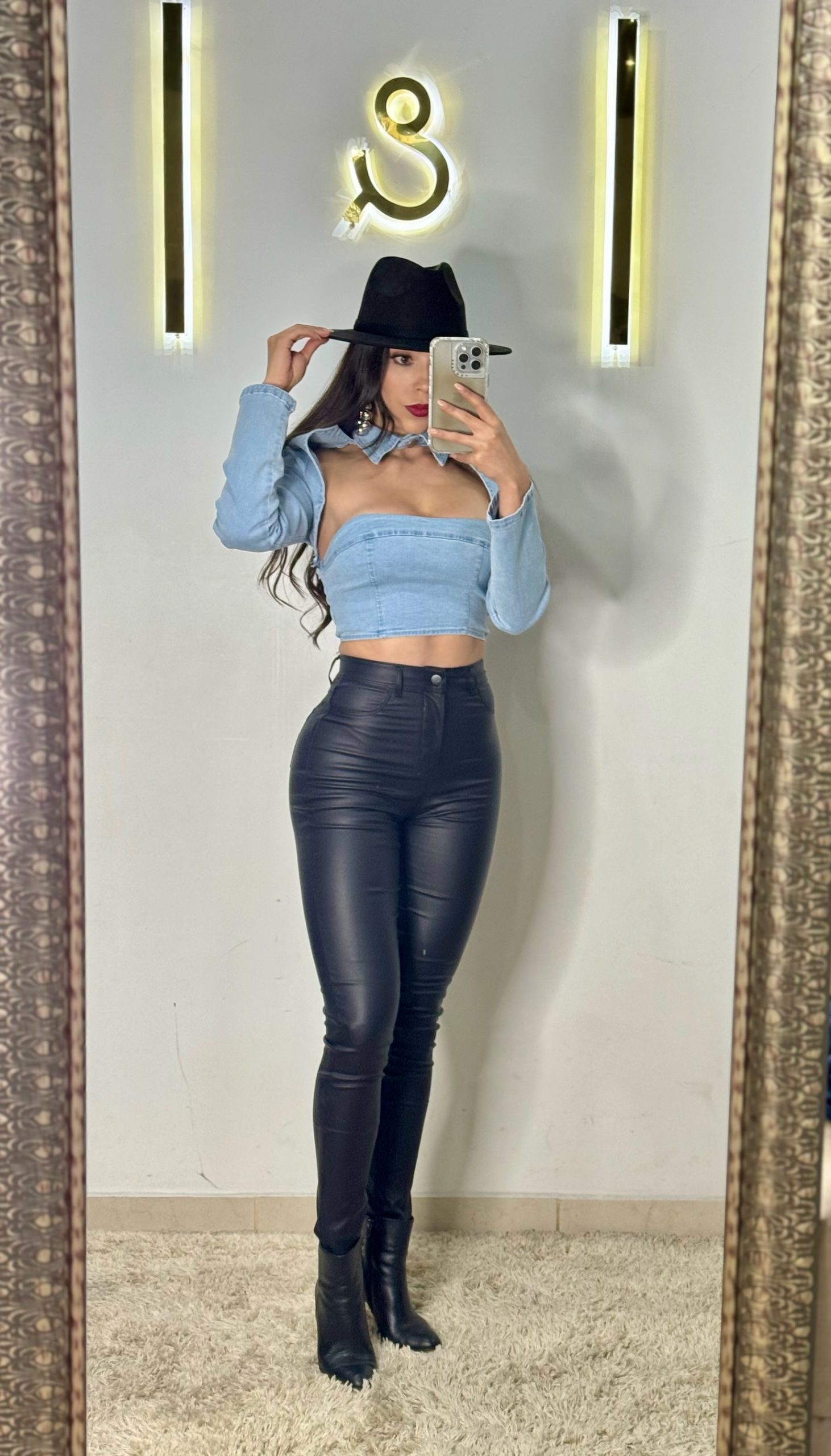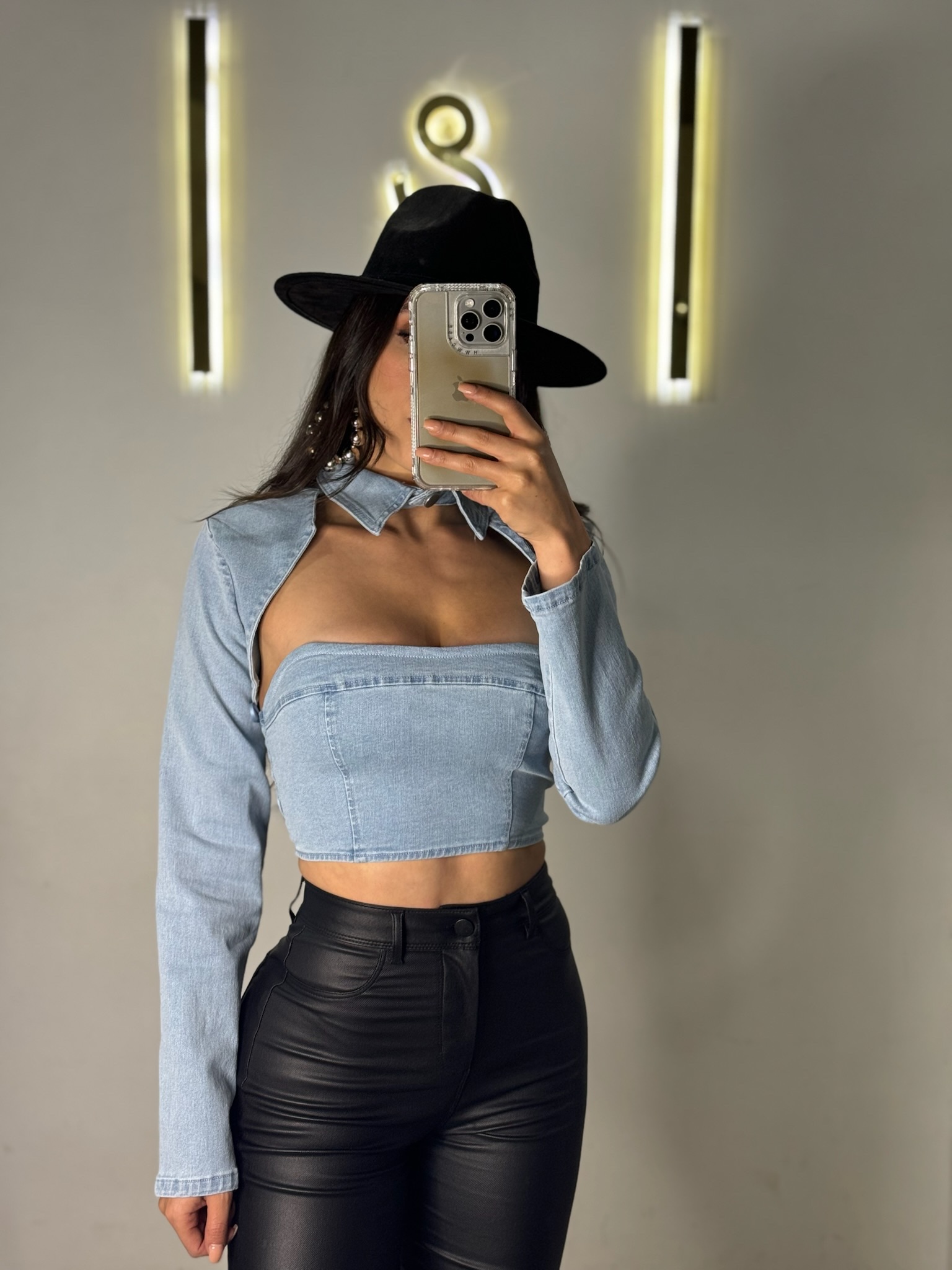Top de dos piezas de mezclilla clara. Top strapless y manga tipo camisera con cuello.