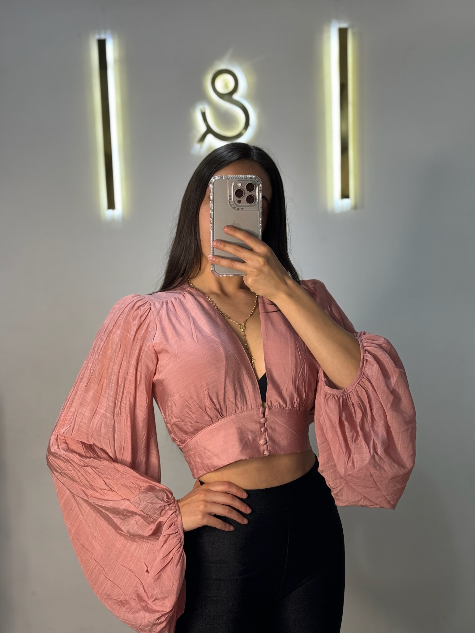 Top corto color palo de rosa con botones y mangas anchas.