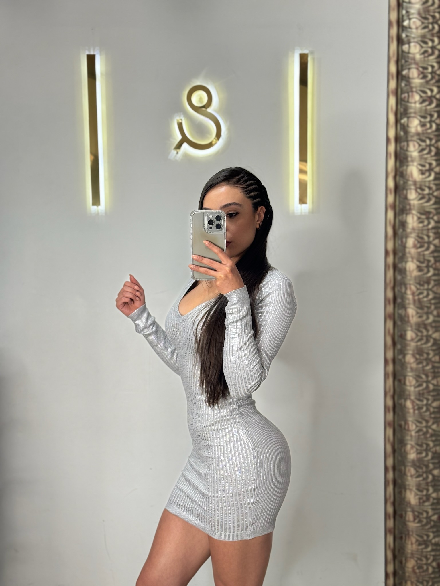 Vestido corto color plateado de punto con escote en V y manga larga.
